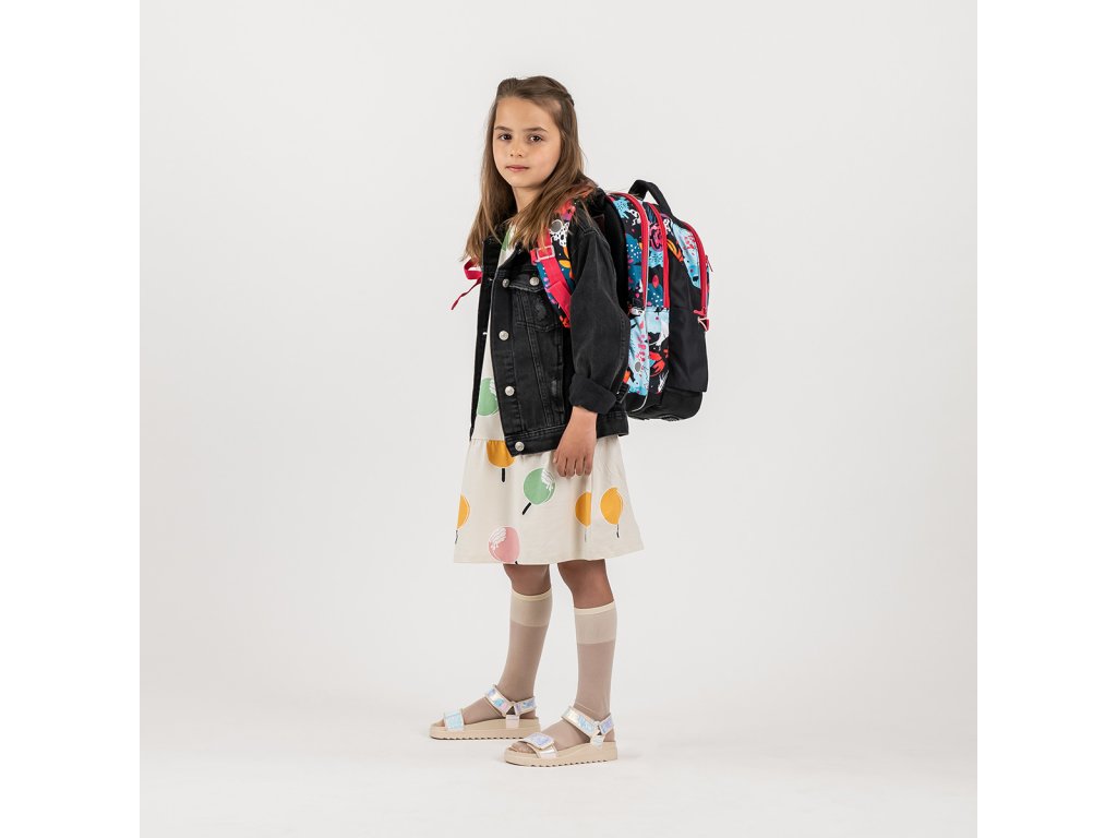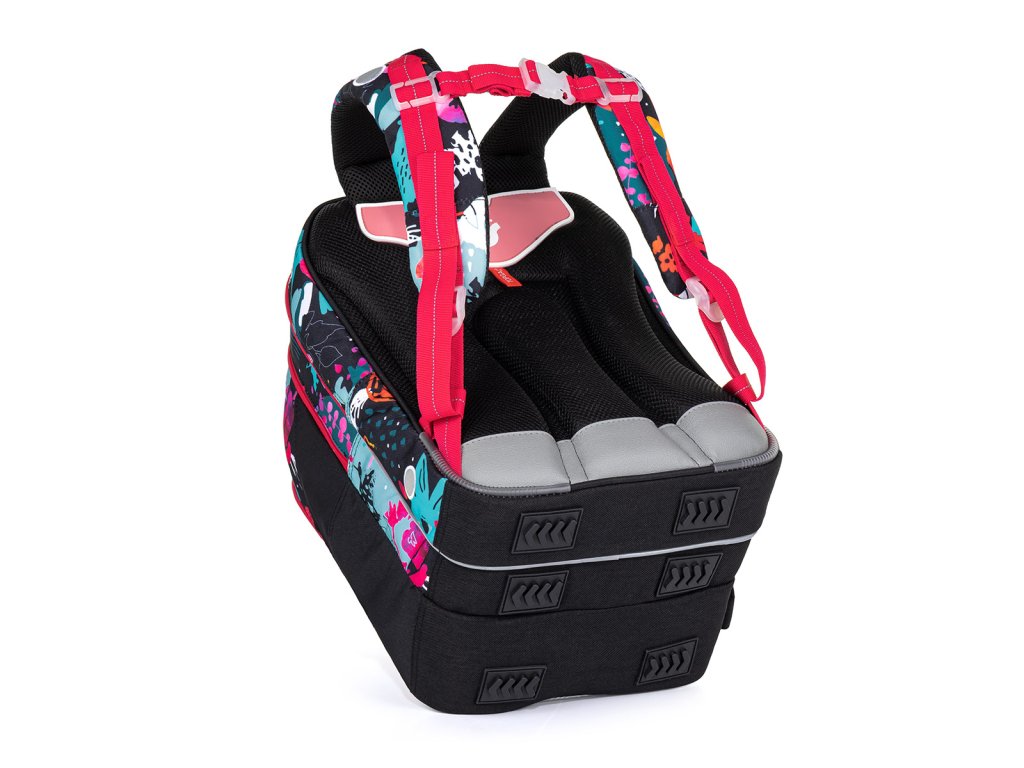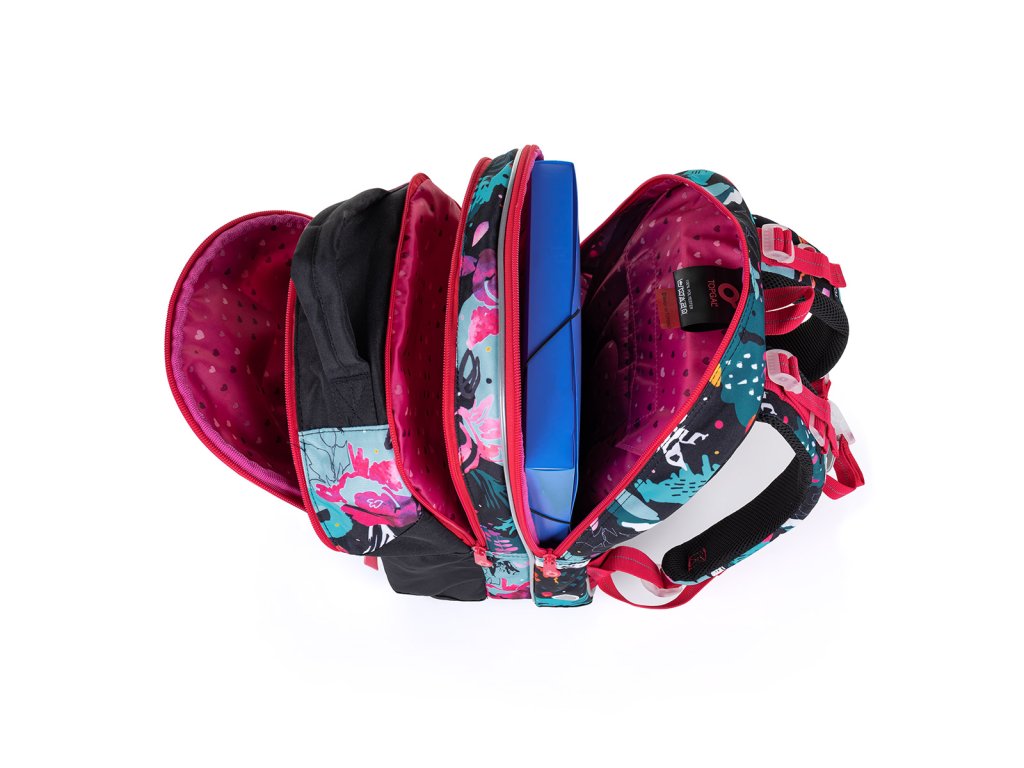 Tříkomorový střih batohu COCO je zřejmě našim nejuniverzálnějším střihem z celé kolekce. Vyhovuje i prvňáčkům, ale díky velkému objemu bude klidně stačit až do 5. třídy! Nový barevný designu na černém podkladu bude vyhovovat všem dívkám na prvním stupni. a maminky ocení, že se tolik nebude špinit...