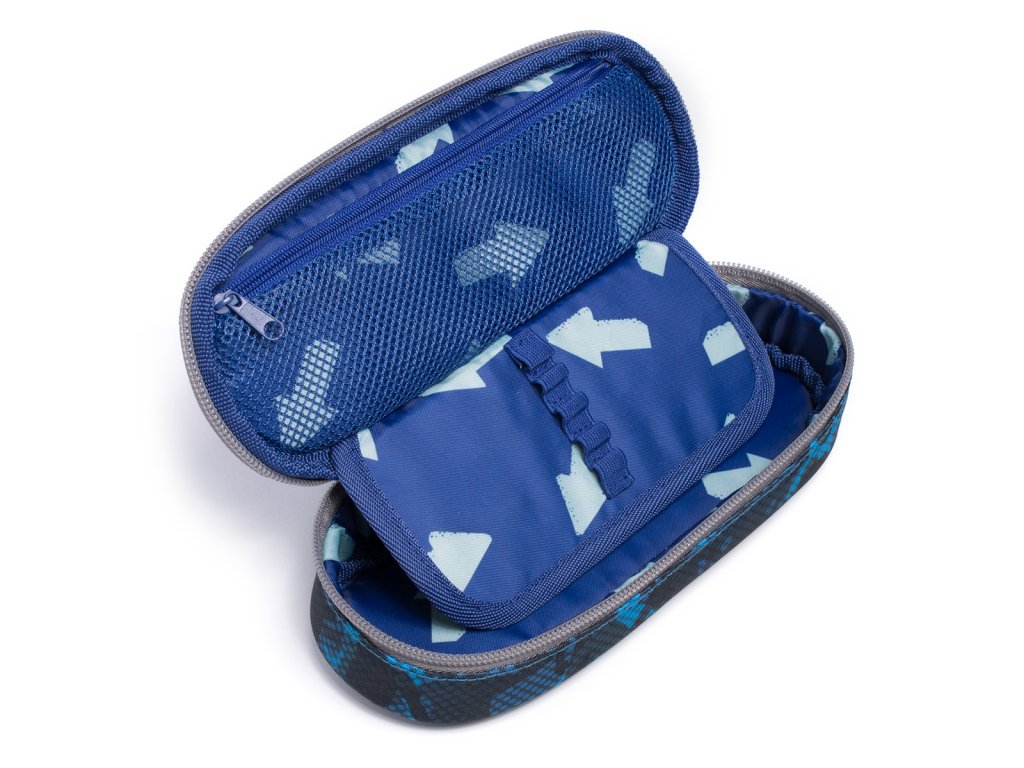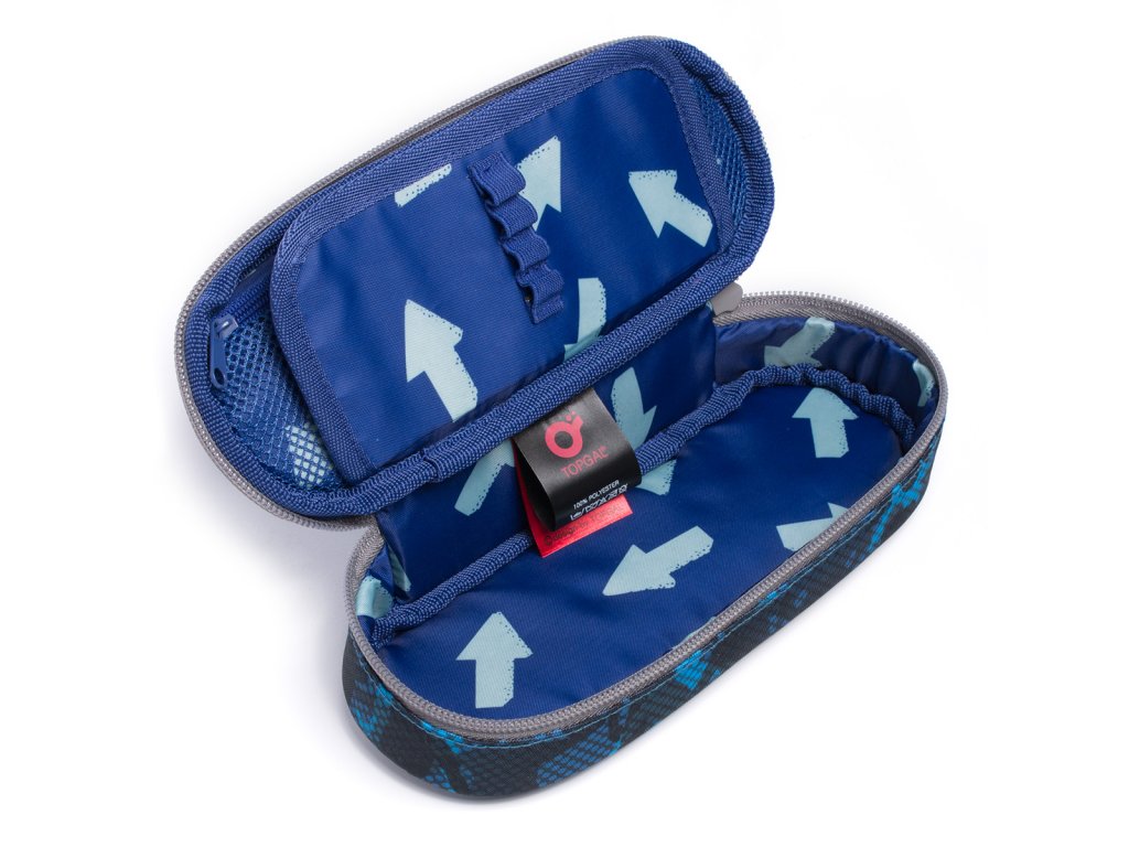 Oválný penál pro všechny potřebnosti ocení spíše starší školáci. Uvnitř pouzdra je síťová kapsička na zip a klopa, na níž jsou umístěny gumičky pro uchycení celkem devíti tužek a propisek, které je potřeba mít přehledně uspořádané a po ruce. Prostor pod klopou pak umožňuje volně umístit další psací potřeby – pastelky, fixy, prostě cokoliv potřebujete.