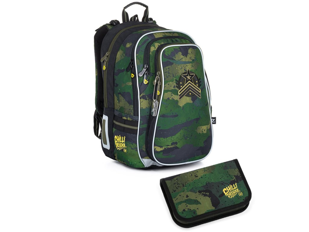 Cenově zvýhodněná školní sada pro školáka ve 2.-5. třídě. Součástí setu jsou tyto produkty: LYNN 21018 - Maskáčový školní batoh, PENN 21018 - Dvouklopový školní penálDoplňkové parametry